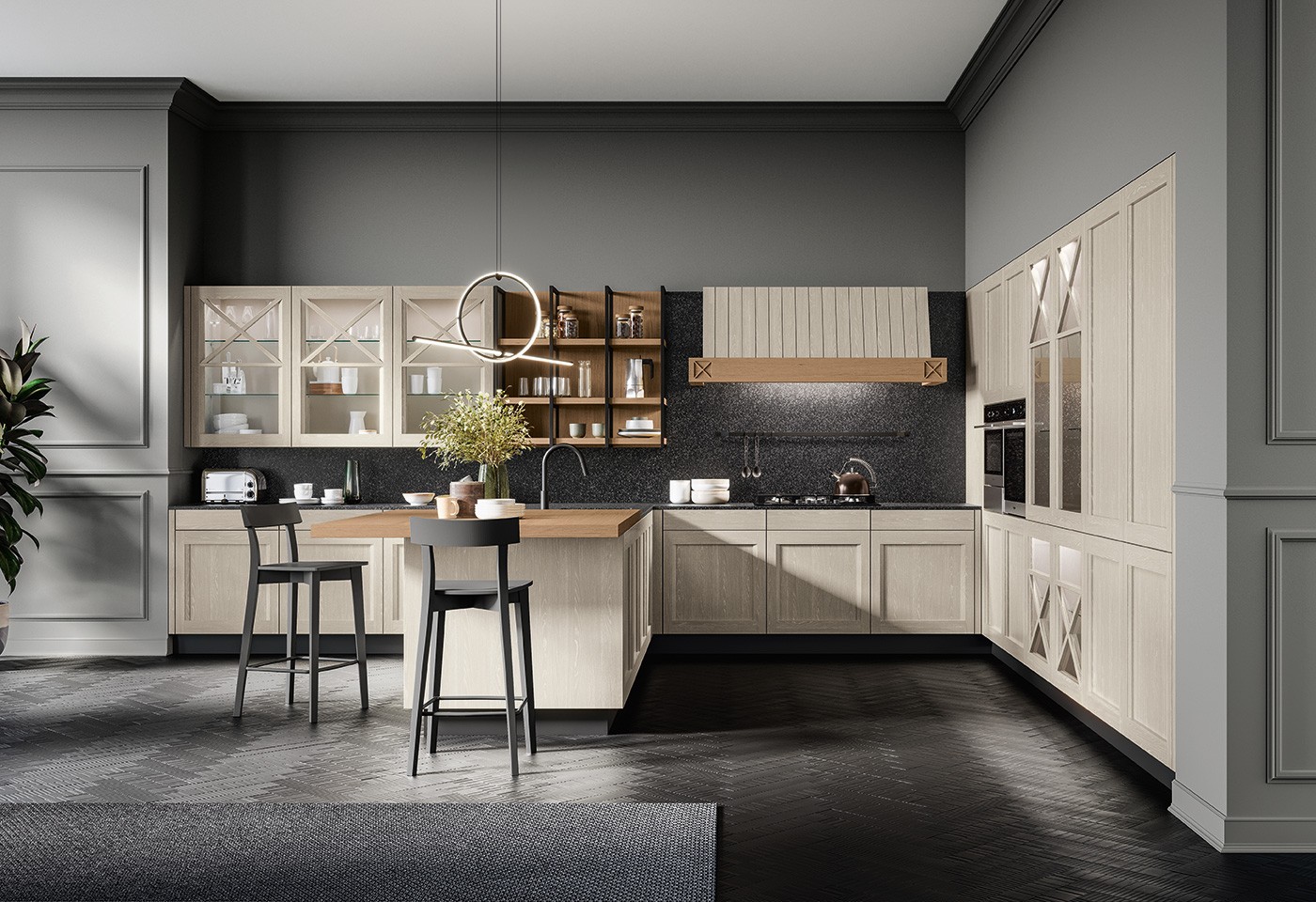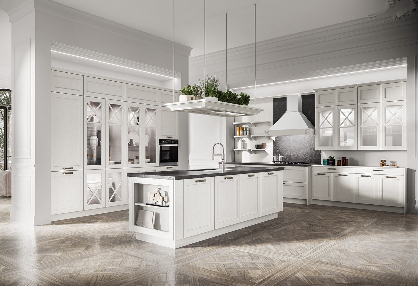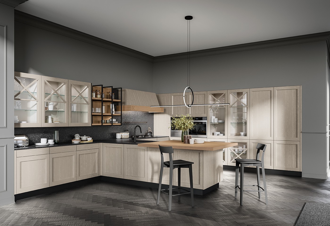 Frida Classic is a highly versatile kitchen, as it offers countless finishes such as matte lacquered, open pore lacquered, pickled or wood finishes and dedicated furnishing accessories. You can choose from metal supports for shelves, slats and an original peninsula support to customise the kitchen. The frame door is available in solid ash with a special integrated handle grip. Frida Classic allows a free choice with dedicated furnishing accessories and various finishes. Find out more, look at the following solutions.
